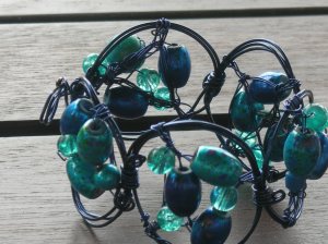 Then I got crazy and tried to do a freeform leaves theme with wire and beads… wire was a 20 gauge light green coated copper and the beads varied from seed beads to delicata. Whimsical, noone at Geneva showed interest….