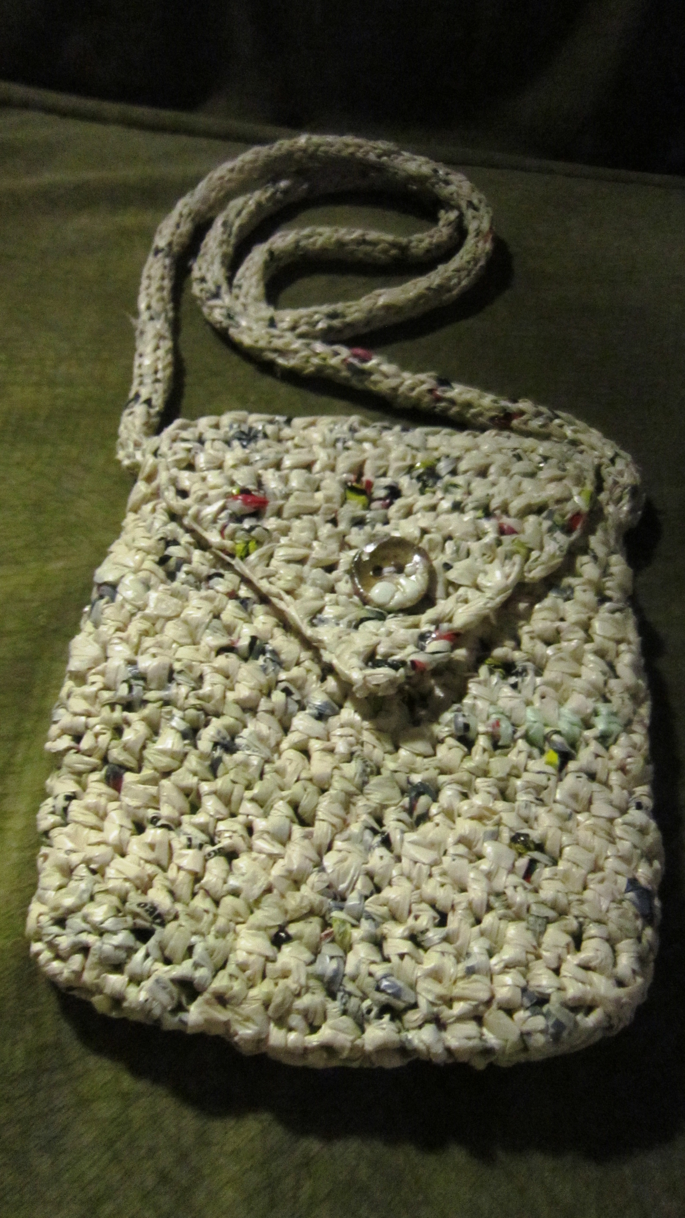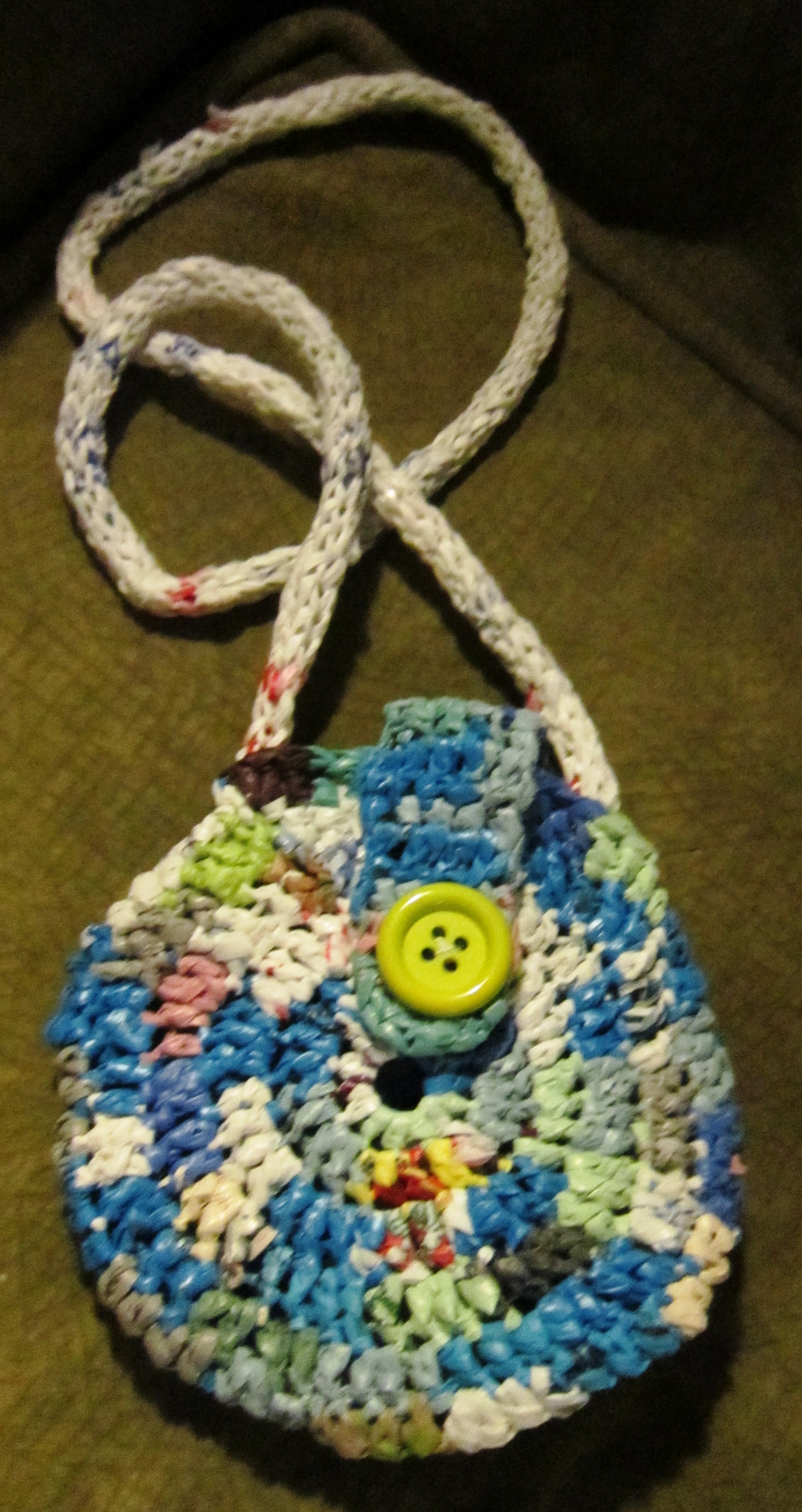 Yes, I have been busy turning all of those bags friends and family have given me into plarn and have been busy crocheting new bags. One old favorite with shoppers seems to be the really small bag that is big enough for cell phone, wallet and keys. I call mine the REblooming Urban Bag. Here are a few of the latest: