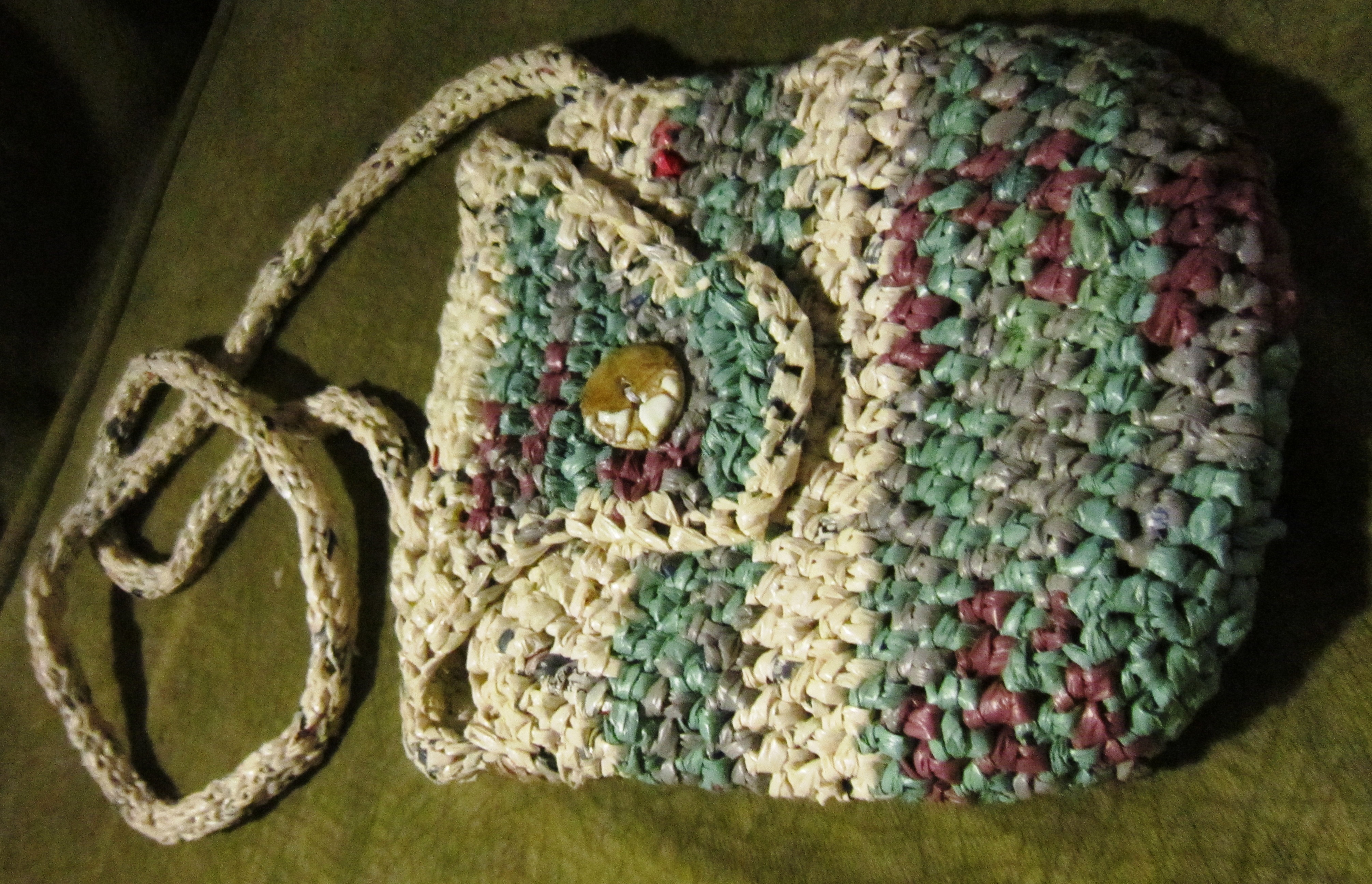 I am also working on larger market bags with a blend of plarn and upcycled sweater yarn and here is one I just finished: