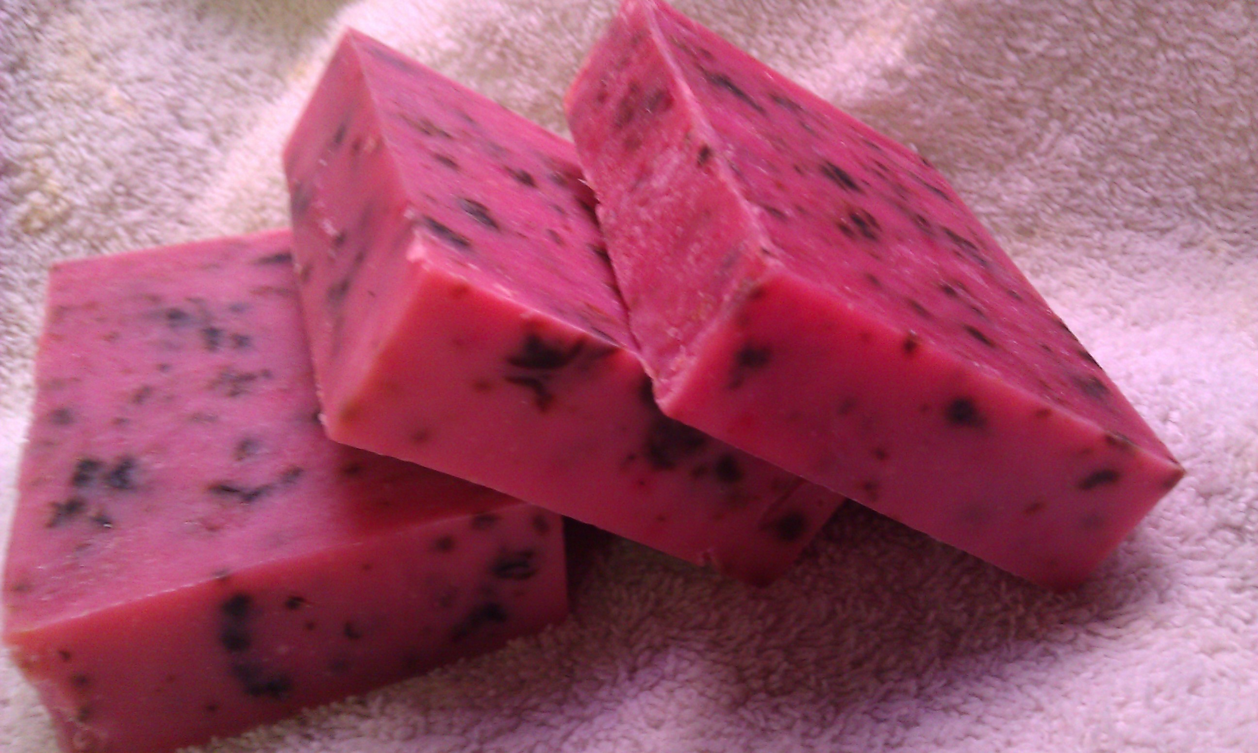 It is a bit more rose colored, and the lather is incredible. (did i mention the benefits of being married to a soap maker is i get the ends, and scraps when he cuts his loaves…..and i get to try it first!!!!)