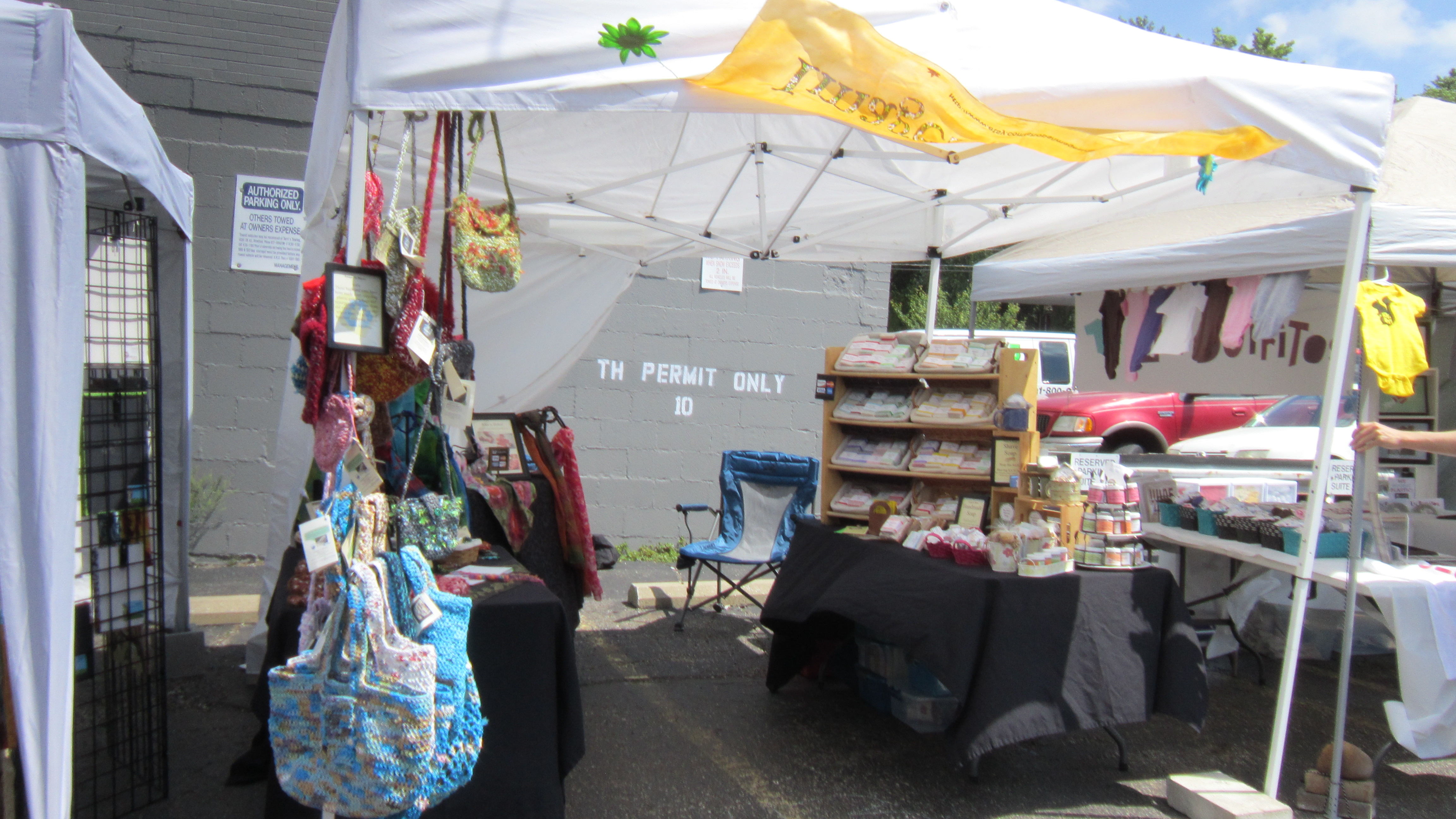 Saturday was a beautiful day in Kent, Ohio,. The festival was well attended, and we had a lot of fun. But we also discovered a new aerobic exercise – tent wrangling. All of the tents were dancing in the high winds, with some lost forever as they toppled end over end like giant tumble weeds. Ours just listed, like an injured bird. The repairs made to the trusses that had been broken when we lent the tent out were stressed to the max in the force of the high winds, and one by one they snapped. Duct tape to the rescue… the structure was stabilized and we weighted each pole with 100 lbs per post. That should have done it, but because the structure was compromised any further pressure from the wind made the tent dance more and more. At one point Steve and I were holding onto the leading corners , resting my full body wait in opposition to the force on the tent, we were stable. But in the end the force of the wind, and a rain storm finally compromised the tent sufficiently that it is probably not usable again. That leaves us in a big quandry… our next show is in 2 weeks, and we will need to find another tent for it.