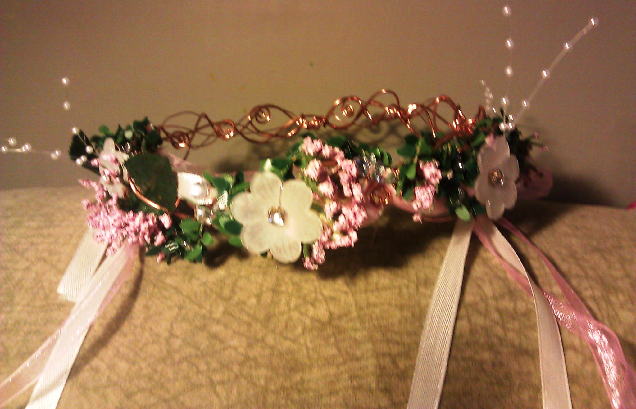 A maiden's crown, of florals and leaves, evokes woodland gardens. Handcrafted of copper coated aluminum wire and embellished with flora and ribbon.