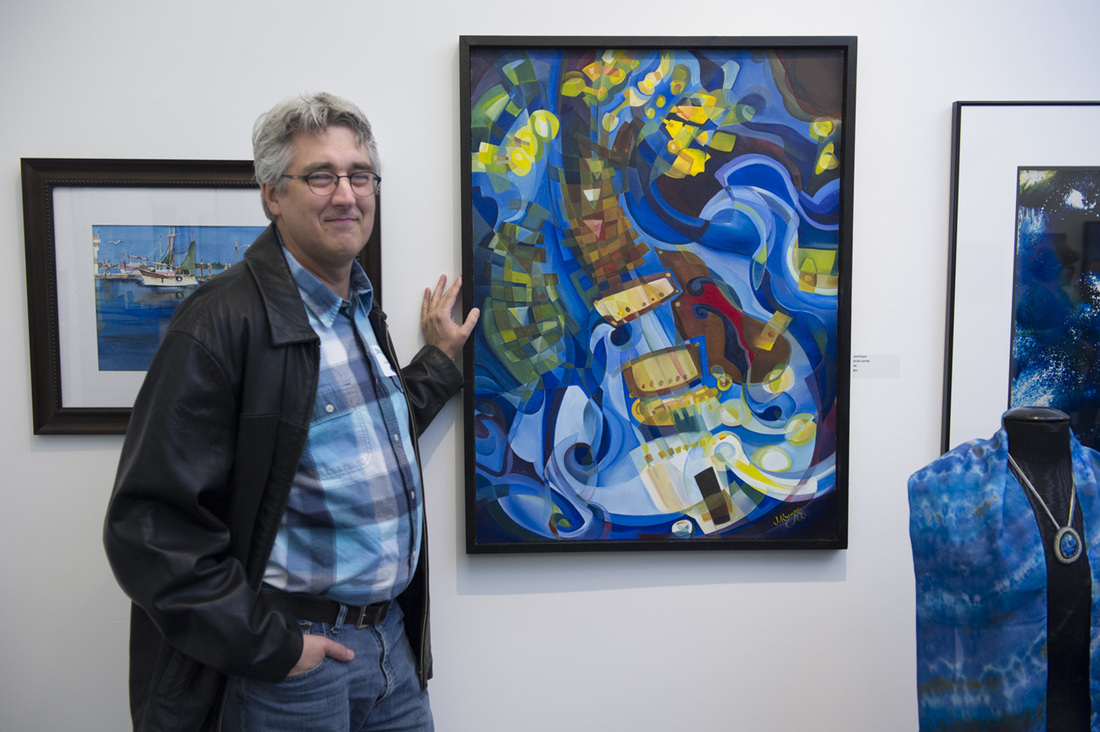 Valley Arts Center in Chagrin Falls was the setting for a two month long exhibit titled “Moody Blues”, an exhibit showcasing the many variations of blue in art. All media was accepted through a jury process. I submitted multiple entries of my shibori silk scarves, with “the storm” being the one they selected for entry.