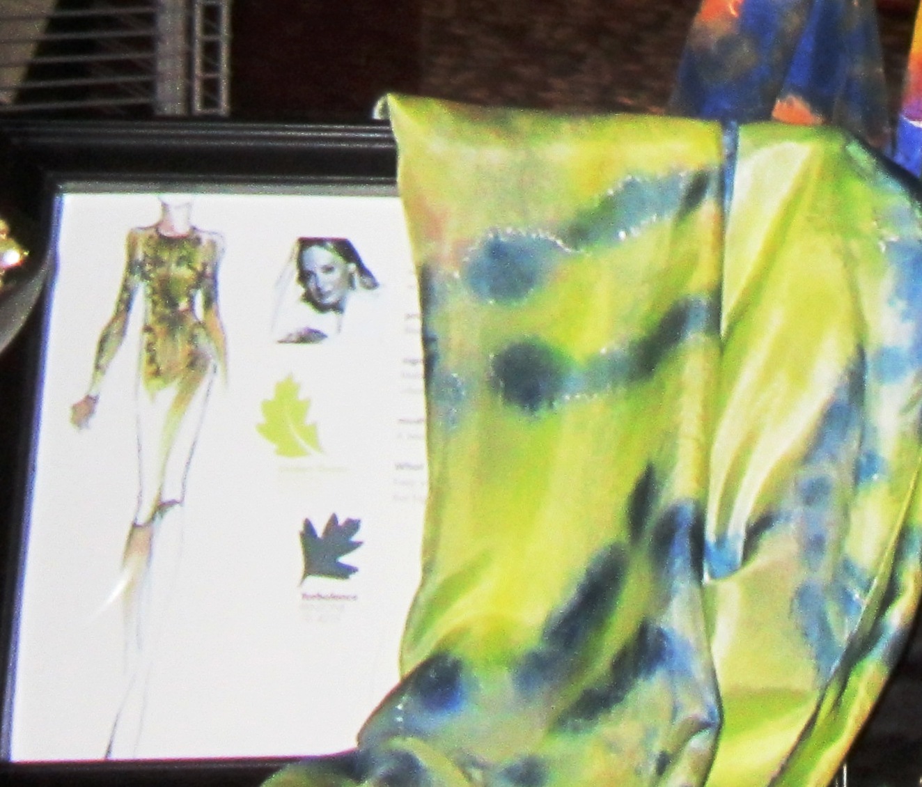And to showcase them at TAA, I bought 8×10 frames, and framed each of the designer concepts, then gently draped my scarf over a corner of the frame. This created some buzz… however i can;t tell you how many people wanted to know if I have the skirt at the left drawing for sale. (Me, sewing designer clothing, i highly doubt it!!!) After I explained the concept they often were more fascinated. At the left is the Samba and blue (turbulence) scarf with silver metallic resist to accent the pattern. This was tried on by so many people, and finally one woman stopped right in front of it and just stared. I asked her if i could help…. she said “Oh My, this is my sister’s style… i can see her carrying these bold colors with her lovely brunette hair and soft complexion… i will take it.” She never looked at the price tag… said she was surprised it was not as expensive as she expected. wow. blown away that this work connected with someone… this is my hope, to appeal to people who can see themselves or someone else wear my creations in their style.