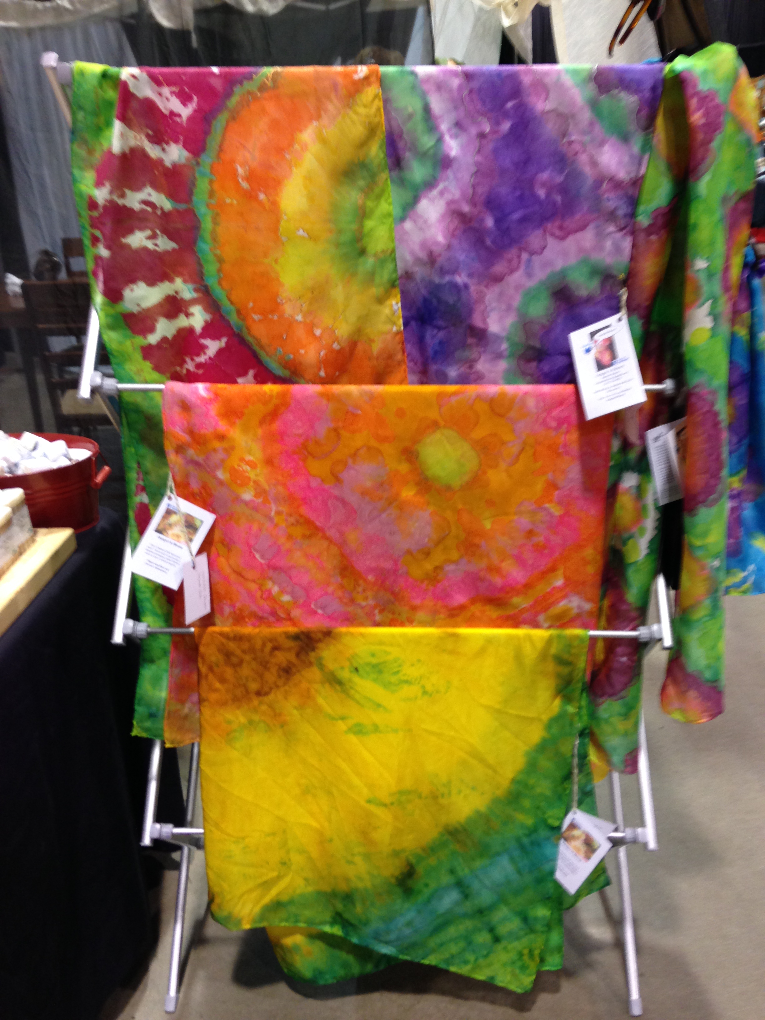 And our subject is this… is there a different perception of artists who are willing to travel to another city? Is it possible that while your work is appreciated in your home geography, when you opt to travel away from home the value becomes more winsome to the market? Or is there just a different market in another city? So many questions to ponder. Oddly this all began with the quick and definitive sale of my rack of hand dyed shibori silk. Unlike the “totally dedicated fiber artists” who have their entire 10 ft by 10 ft filled with a boutique of fashion… I present either one floor rack of silk, or several small racks on a table. I share the space with our soap business…. and somehow the soap and the silk complement each other. But often the silk takes a back seat, and the crowds flock in on the soap rack. (We love that sensory involvement and inevitably someone goes “OOOOH, Smell this one” while sharing their love of scent with anyone around them.)