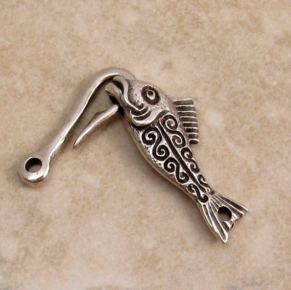 And over the weekend two of my newest bracelets sold. I had purchased unique cast bracelet closures – they are called the Mykonos Fish, after an ancient design of a fish, with a large fish hook that fits in and hooks the bracelet closed. I had a variety of vintage blue glass beads, and mykonos clay beads in matte finish in washed out blue, and a deep ocean blue, and a rust to blue, that accented each other. Here is the clasp, and the only picture i have of the Mykonos Fish bracelet (Its the one at the far right in the picture below).