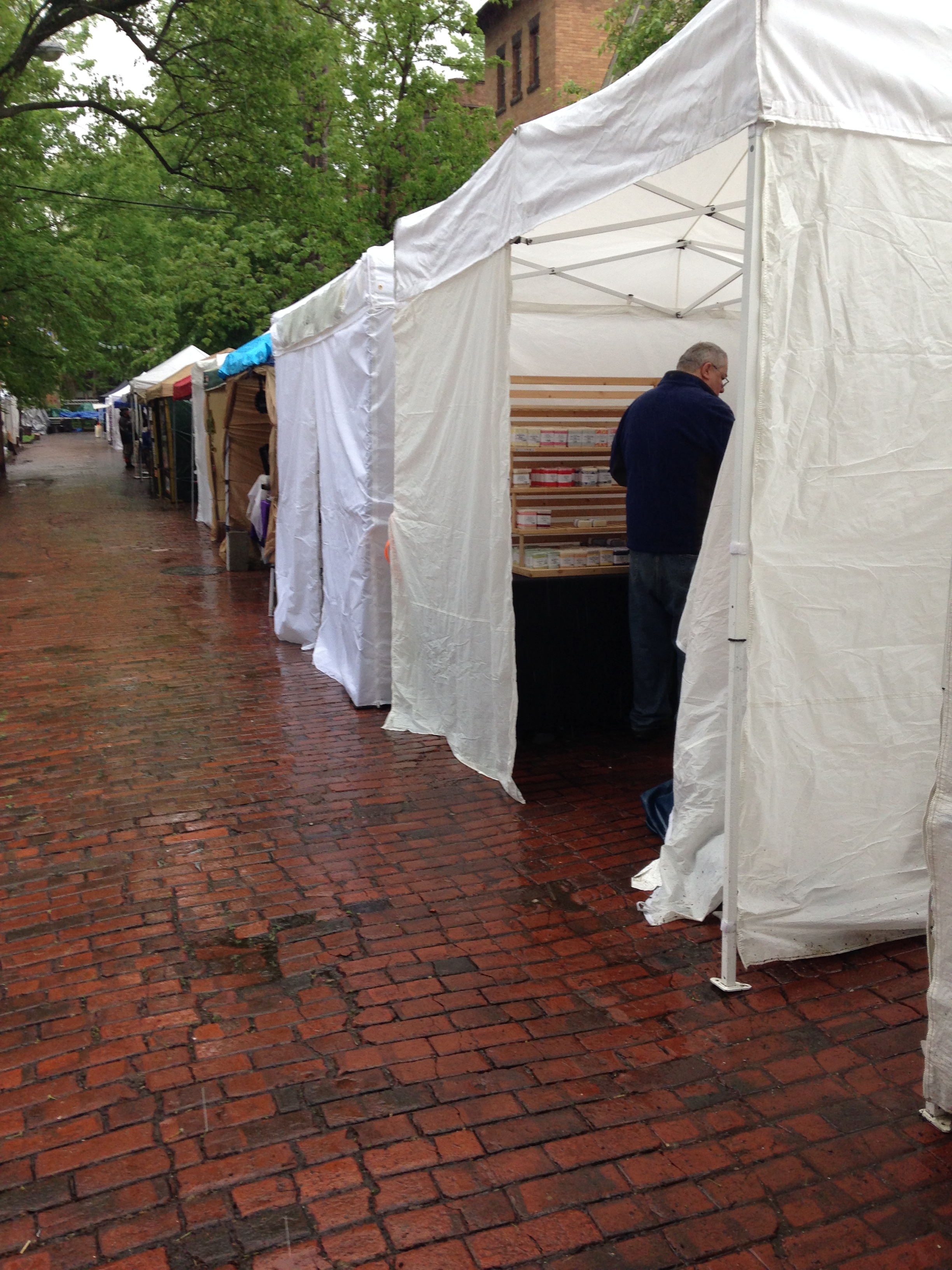 Or the small monthly market we used to do out east… we set up in sun, but out of nowhere the clouds opened up and there was not one thing dry… except out tubs of soap. everything we were wearing was drenched. The organizer hid in her coffee shop in town until the weather passed, then walked through to make sure all was well. The ground was drenched, and the grass was slippery. The rain drove off the crowds, and we never really had a good day.