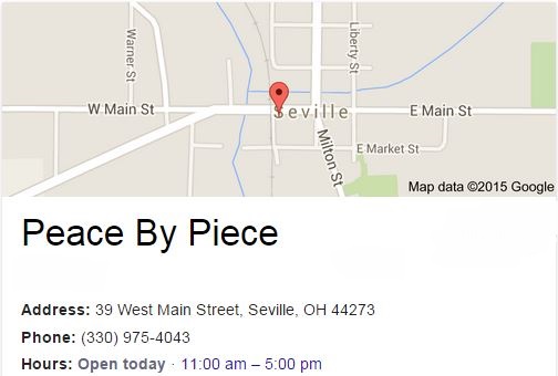 Last September we took a drive on a hot summer Saturday to visit a friend at an art fair in Seville, Ohio. Located in Medina county, Seville is a quaint little touristy village is a large structure that might have once been either a hotel or boarding house. Now home of Peace by Piece, an amazing collection of artistic and creative endeavors from around the region, and another place our soap is available. Wendy James, one of the owners, has a great eye for amazing things… from beautiful ceramic pieces, and hand blown glass, to upcycled vintage furniture. There are rooms to explore and so much to see and buy.