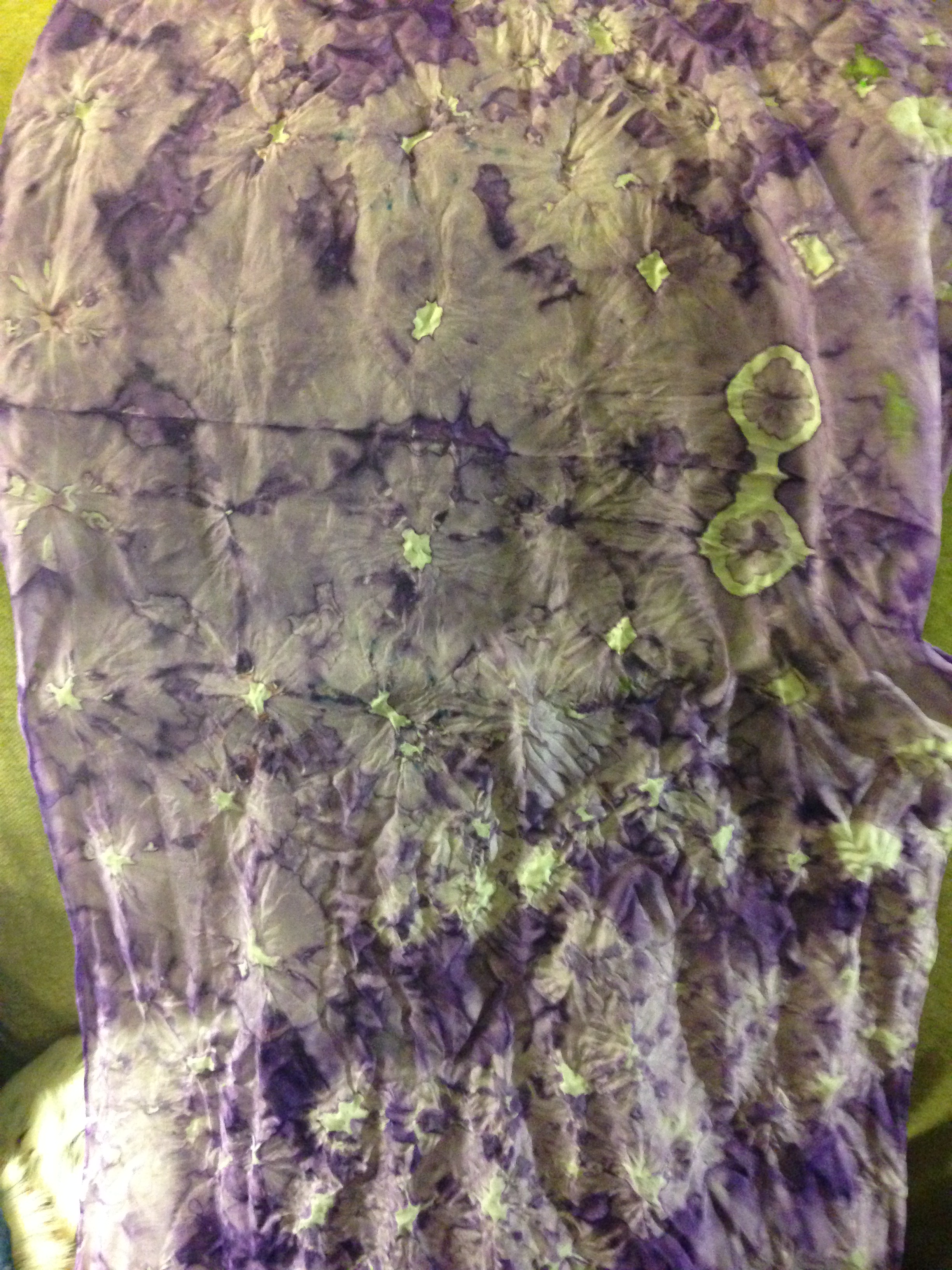 When the gatherings are small, and many a pattern can develop that has great interest. Tight and small binding results in tight patterning, more white space. The Japanese have a tool they use to assist with creating these small gatherings. I bind my fabric by hand resulting in a less consistent pattern. But here is the outcome of a tightly gathered Kumo Shibori. I think I like it. Once I have all of my silk steamed and pressed I will take much better photos.