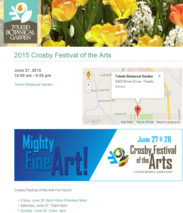 Another new, and very exciting new venue for us is Crosby Garden (Toledo Botanical Garden) for Festival of the Arts. Set against a beautifully landscaped botanical garden will be the tents of over 200 artists. This event is a very prestigious one, and very difficult to get into. We are grateful and thankful to have this opportunity. We have a sizable client base in the Detroit Area, which makes this a nice one tank trip. Its not so far from Cleveland either. High hopes for wonderful weather , great art, lovely music and lots of new opportunities to meet people.