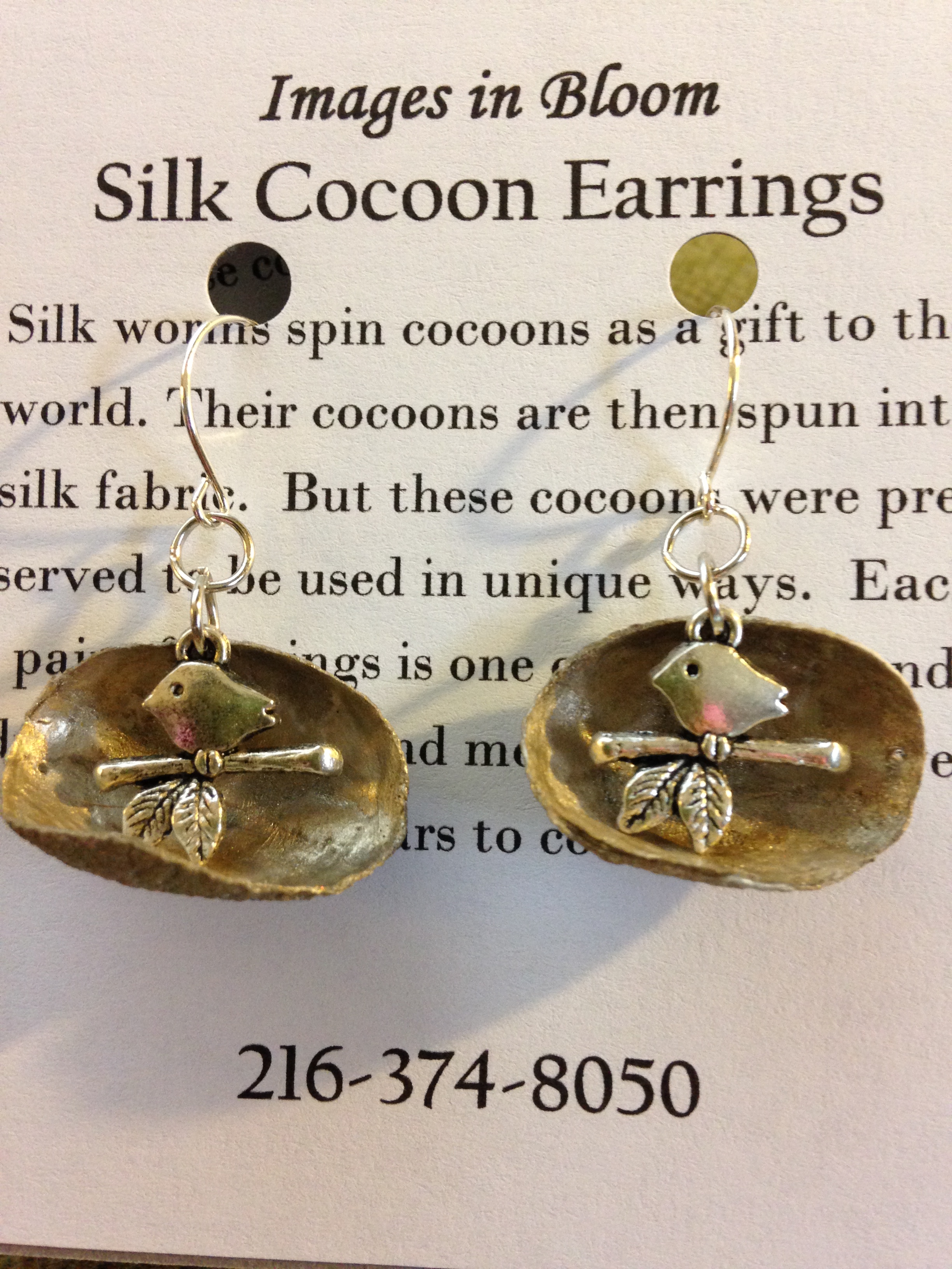 half cocoons, painted platinum with a charm of a bird suspended in the cup form of the cocoon.