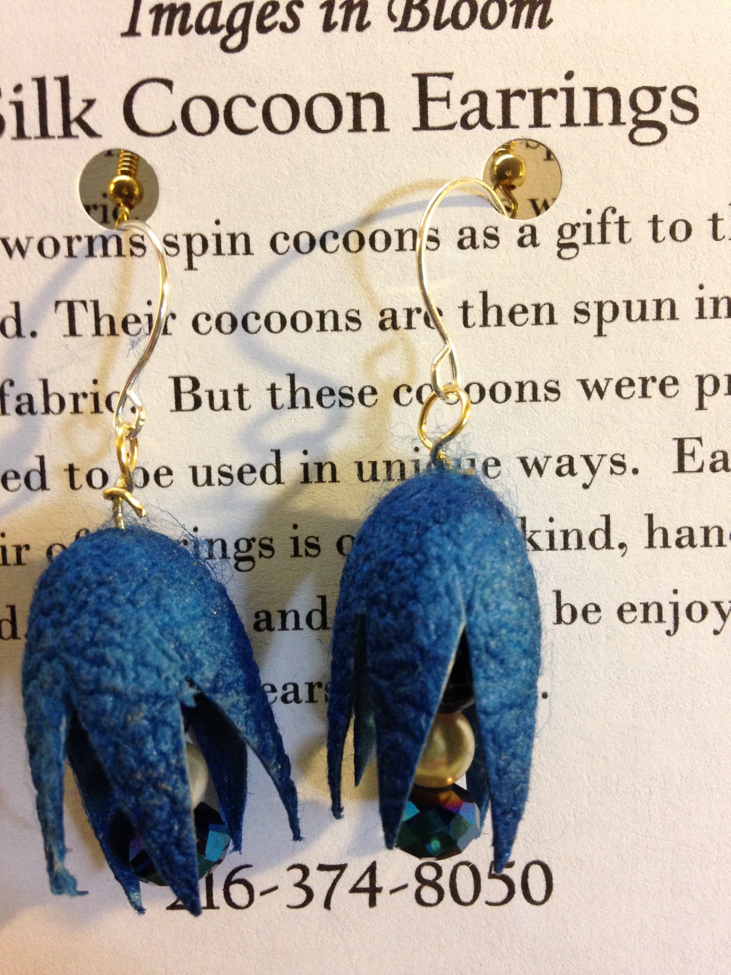 Silk cocoons dyed blue and cropped to have petal points. Suspended from the center is a dangle of czech glass sparkles.