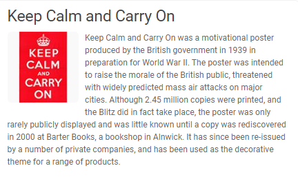 - Keep calm and carry on – that famous posted from WWII era England is just good sense. No matter what else is happening in the world, the daily routine is a stabilizing force in life… having that sense of purpose to cook dinner, do laundry, grocery shop, walk the dog will always continue.