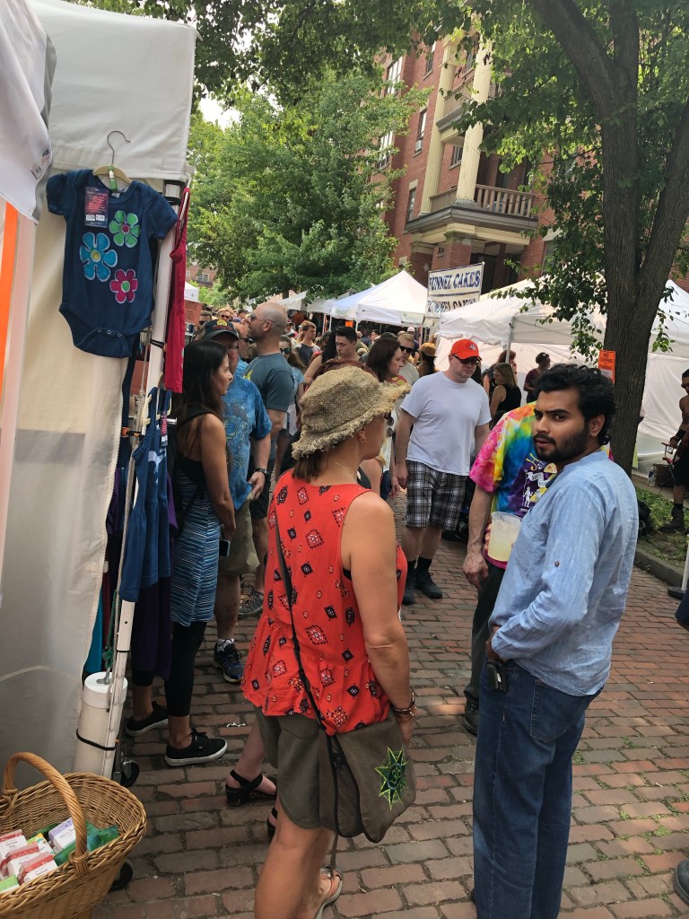 It was late May and college graduation season that year we did our first Hessler Street fair. Hessler is a Street on the campus of Case Western reserve University, a private college on the east side of Cleveland. Hessler Street fair began in the 1960s when the college itself was trying to bulldoze down old Row houses for they are building expansion program. The inexpensive student housing which was on Hessler Street was some thing the students didn’t want to lose so they started an art and music festival and basically sat in refusing to move. Eventually the college gave up and let the street remain. But the festival continued annually as an art and music festival featuring 50 artists and a live music stageWith 20 to 25 bands over the two day period. Many of the old hippies come back and were organizers of the event. The atmosphere was fun, the crowd was very diverse and eclectic. Those two days went so quickly and we had so much fun. But the one the siding that took the cake was a guy who dressed in a Superman costume that was far too small for him. He played guitar and was a wealth of old country music knowledge although I don’t think his current ability to think was strong. It was just humorous and unique.