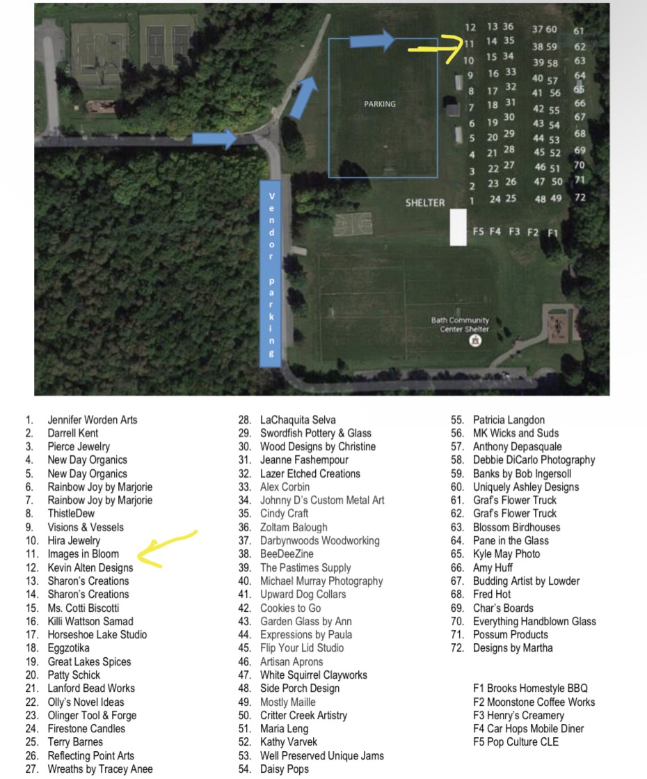You will find us this saturday in the Bath Community Park located at 1615 N Cleveland Massillon Road. There are 72 booths of artists as well as food vendors and music. We are in the first row, booth #11.