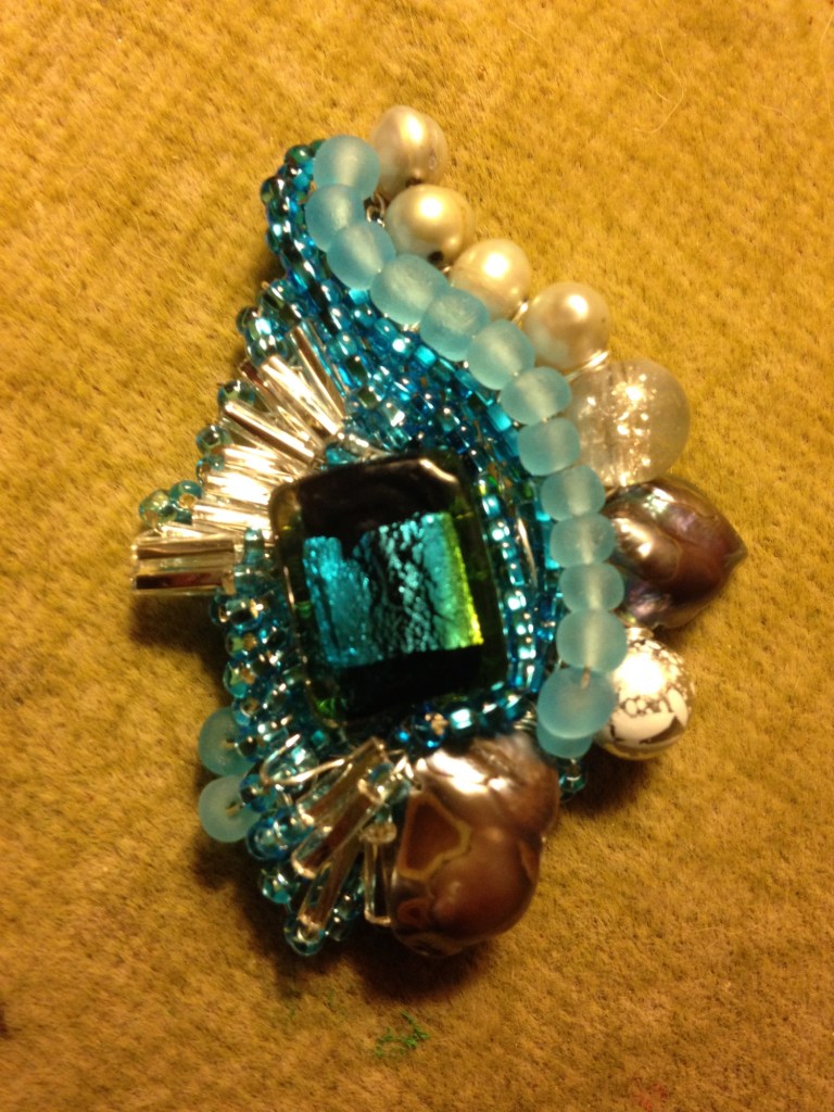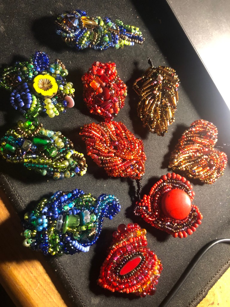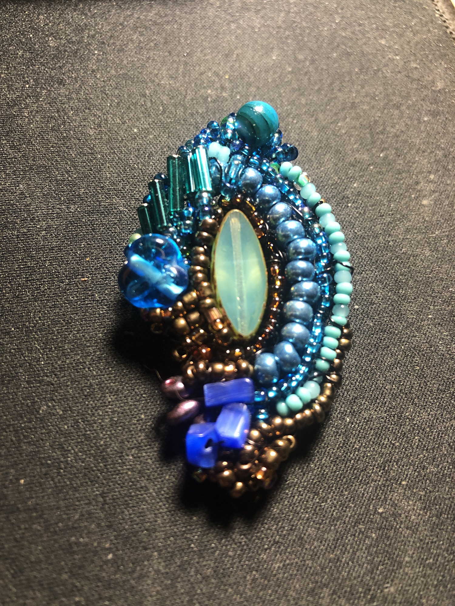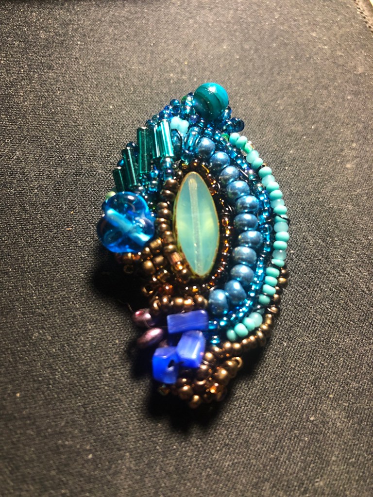 Fast forward to the fall of 2023 and i was cleaning the studio and found a box of brooches that had not sold. I put them out and they sold like crazy – leaving only the two ugly “what was i thinking” ones. Inspired by the popularity of them i began again spending the long winter nights working on them. Hearts, and feathers, and asymmetric brooches with a focal bead. Then it happened – “Someone said “Brooches, oh isn’t that so grandma! Does anyone wear them any more?”