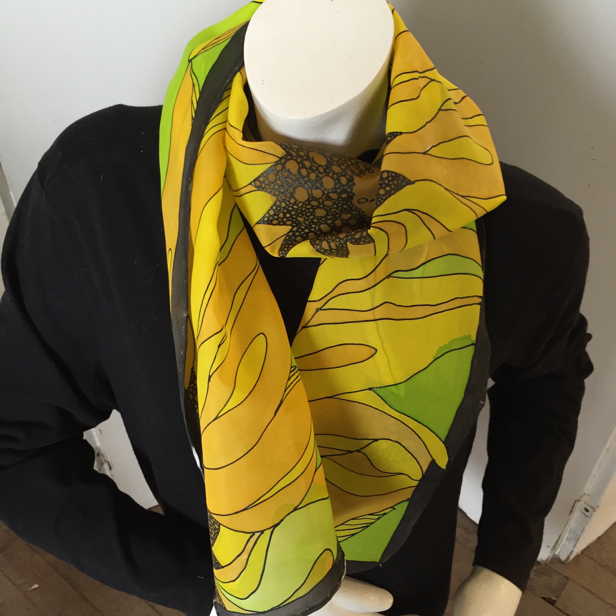 Fast forward to 2010 when our world fell apart I opened that box and thought maybe i can find a way of making some money by painting scarves. Fast forward to our first studio and the space to spread out and paint, and my passion exploded.