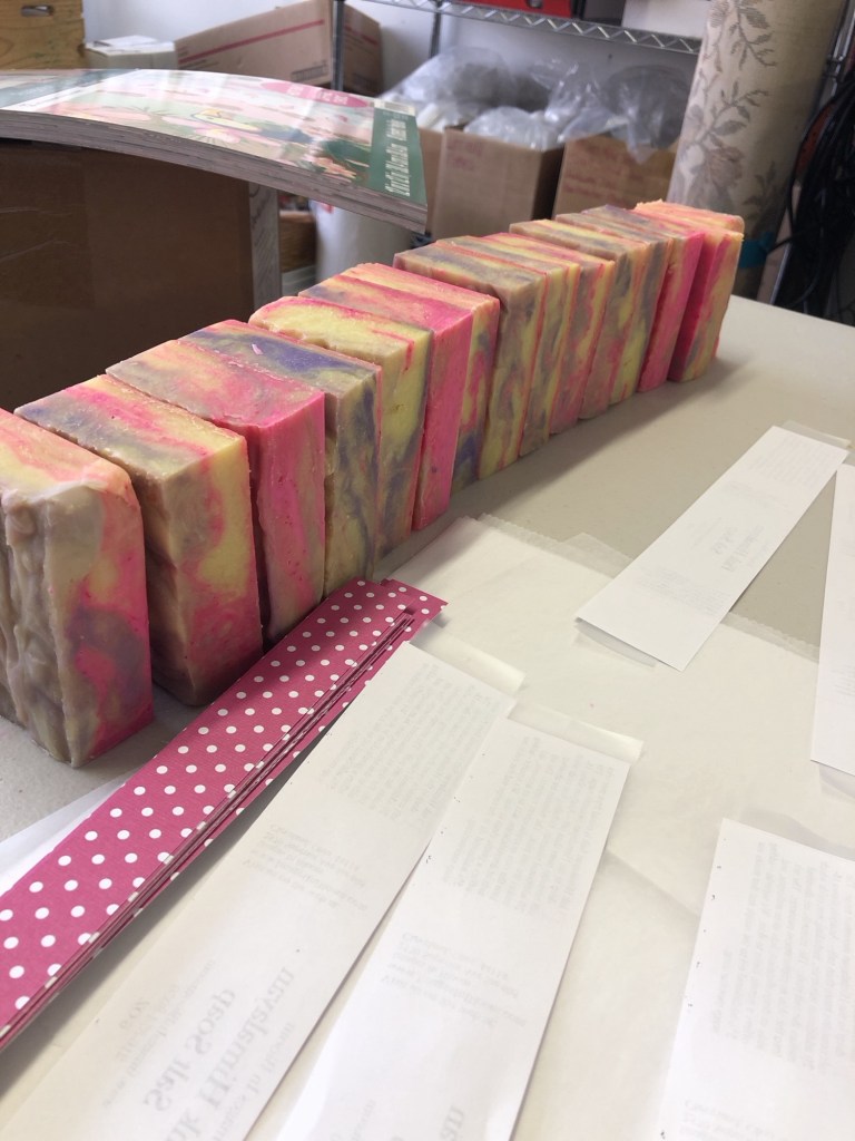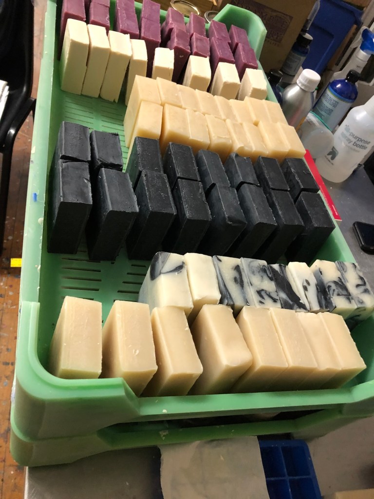 We have several soap cutting implements that allow us to turn each 4 pound slab of soap into 20 bars. Once the soap is cut we have drying racks – allowing the soap to fully neutralize in pH, as well as dry enough to be wrapped. We check the pH of the soap and do not wrap it until the pH is neutral