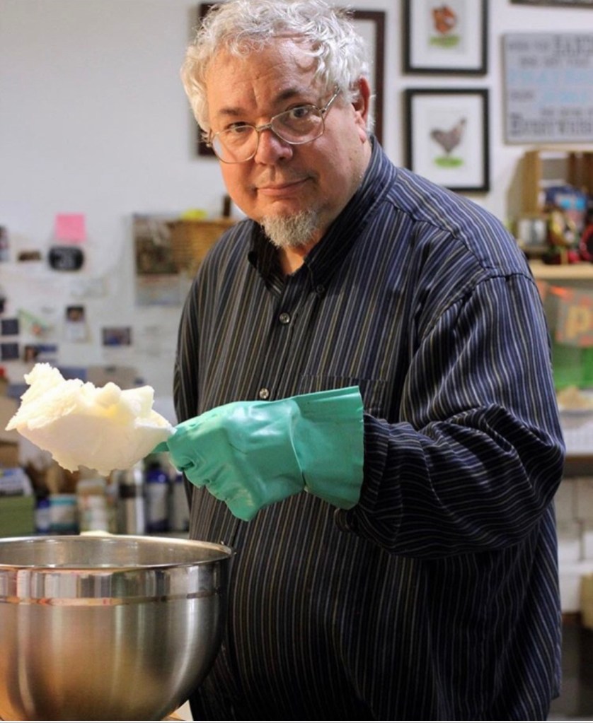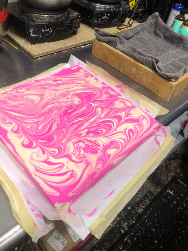The mold of soap will sit for at least 24 hours to go through the chemical reaction known as saponification. The “pudding mix” is initially quite hot. As the soap mix cools the pH of the soap begins to slowly neutralize. Within 24 hours the “pudding” is now hard enough to be cut.