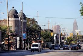 The coppertop building, and a view to downtown Cleveland from the St Clair Superior Neighborhood